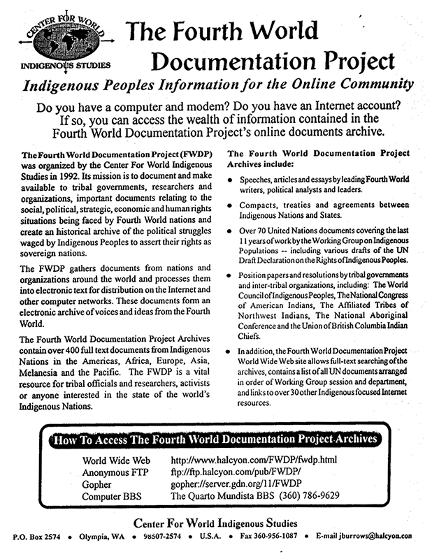 During the 1980s through the present, CWIS has grown into a research, education, and policy think tank—continuing to build its repository while also generating new knowledge through advisory services, technical support, and work in Fourth World geopolitics and traditional medicine.